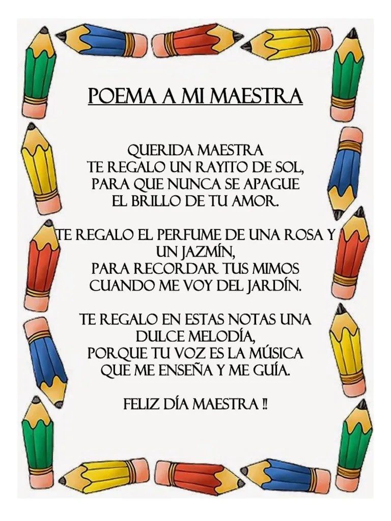 Feliz frases día del maestro. Feliz día del maestro y el profesor. Teniendo siempre por delante el amor a tu deber. «maestra vieja», «adiós a la maestra» y «maestro» son otros ejemplos de poemas y creaciones literarias relacionadas con esta palabra tan hermosa. Poemas para el día del maestro. Que das con gusto en tu salón. Esfuerzo que haces cada día al educarnos. Afianzando van los lazos con las letras y los trazos ¡para que puedas volar! Los mejores poemas al maestro en el portal de humor, entretenimiento y cultura más original. Ser bueno y con virtud para guiar. Feria del libro ( 1 ). Las barreras del atraso las destruyen con su paso ¡con sus puentes del saber! Llenan tus días de hermosa labor, nada fácil es llevar.
