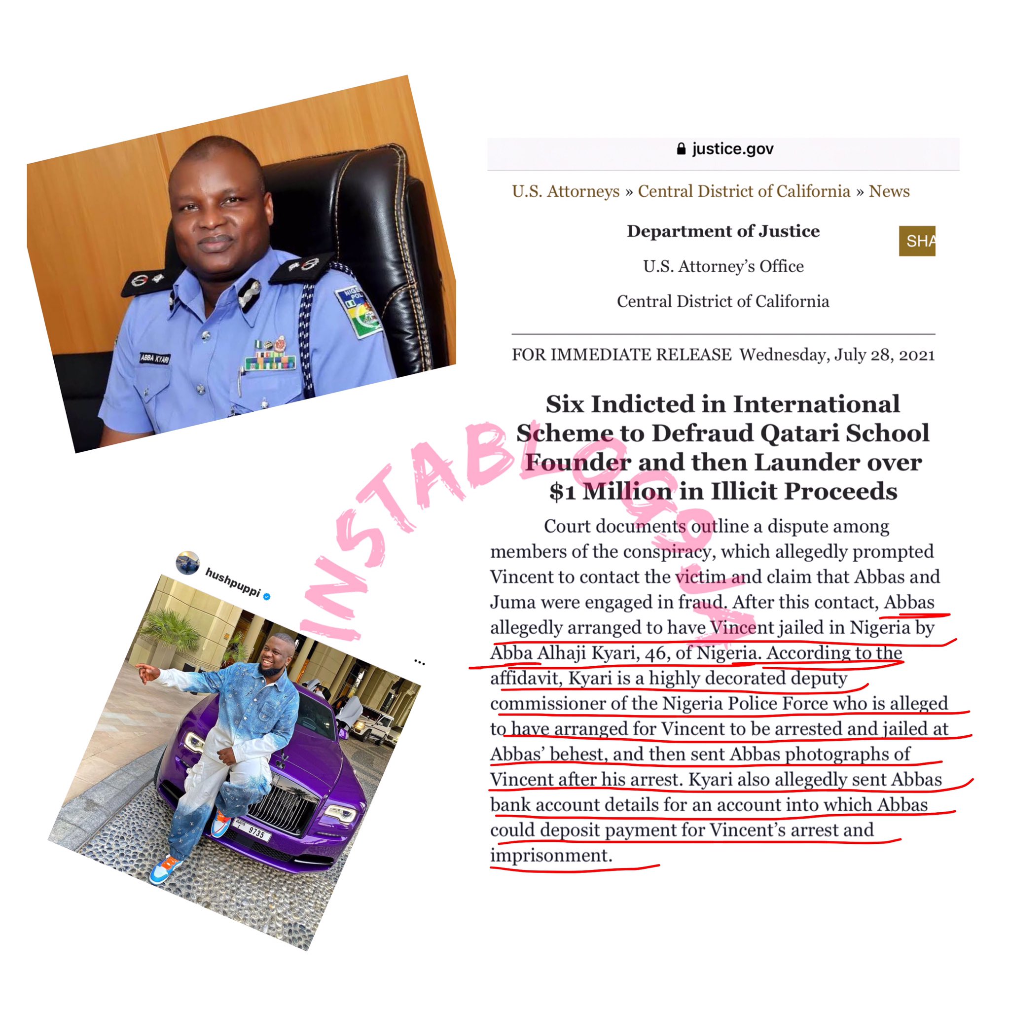 In a statement on his facebook page, kyari confirmed that his squad truly arrested a suspect that hushpuppi claimed was threatening his family in nigeria. Newsflash nigeria had reported that the instagram personality, who is known for his luxury life, was arrested in the. This was contained in a statement signed by force pro, frank mba on thursday, july 29, 2021, noting that ''nigeria police force reaffirms its commitment to the … The united states attorney's office of the central district of california has said that deputy commissioner of police in nigeria, abba kyari, allegedly sent account details for hushpuppi, to deposit money for the arrest and jailing of huspuppi's associate, chibuzo vincent. Deputy commissioner of police, abba kyari, has narrated his encounter with alleged international fraudster, ramon abbas, aka, hushpuppi. Within nigeria had earlier reported that the united states department. Ig orders review of allegations against abba kyari. The police made this known in a statement on thursday, signed by the force public relations officer, cp frank mba. Federal authorities in the u.s. Arrest abba kyari now — reactions trail hushpuppi's 'bribery' allegation. Deputy commissioner of police, abba kyari allegedly used a third party account to collect money from notorious internet fraudster ramon olorunwa abbas popularly known as hushpuppi. Politics nigeria understands that federal authorities in the united states, have been probing hushpuppi since his arrest last year. Deputy commissioner of police, abba kyari, has been linked to the celebrated fraudster, ramon olorunwa abbas, also known as.